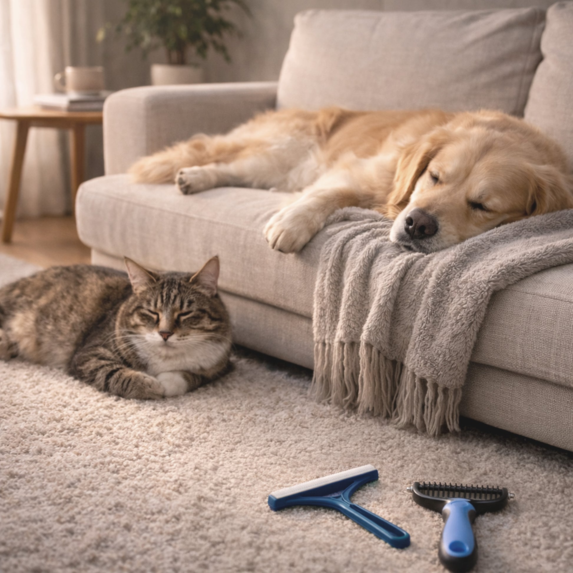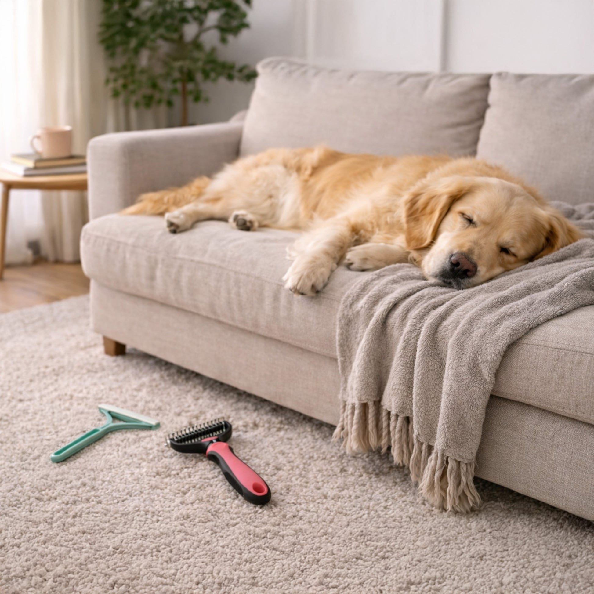Use the Grooming Rake 1–2 times per week to reduce loose undercoat before it spreads. Use the Everyday Brush to lift what lands on sofas, blankets, car seats, and clothing as needed.