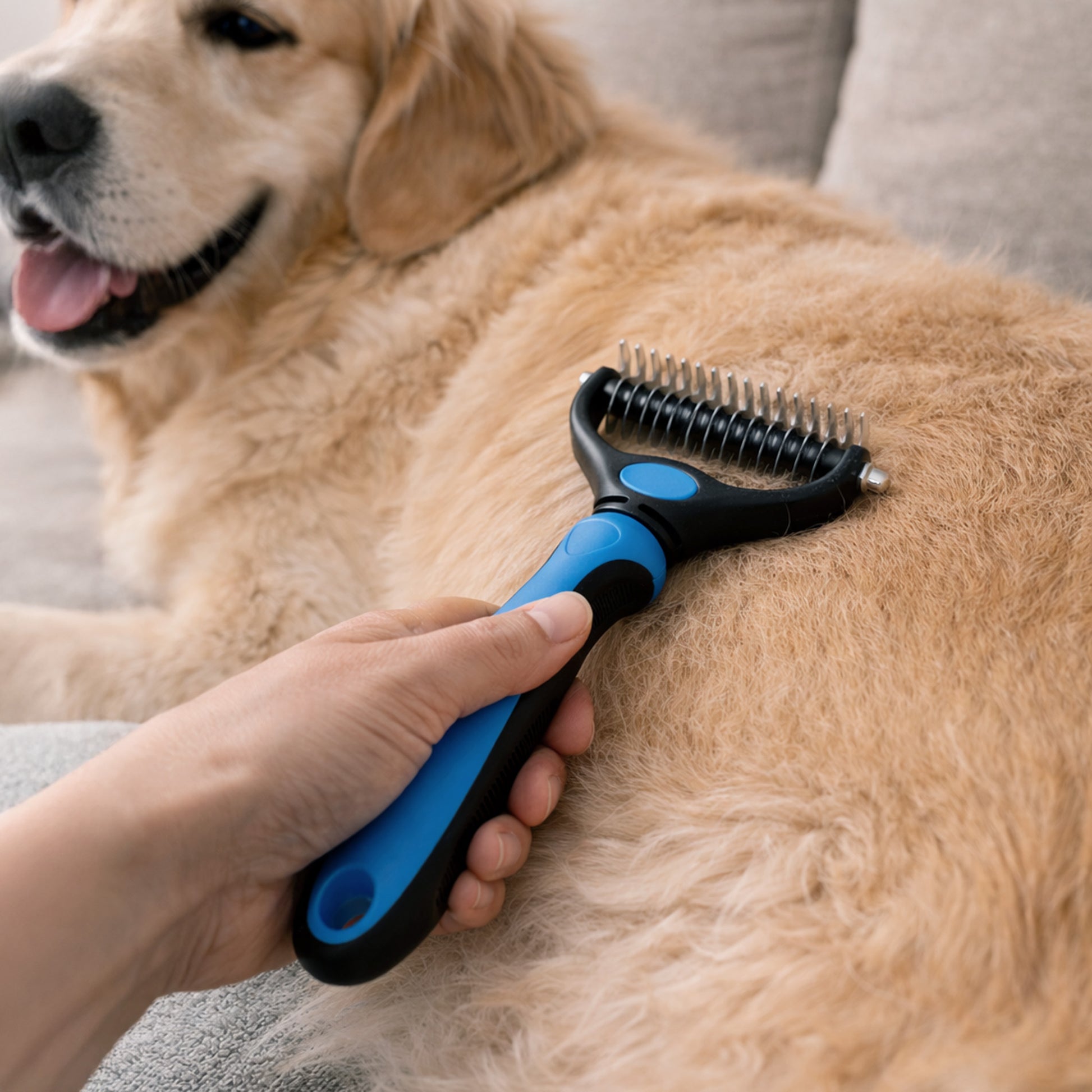 Use the Grooming Rake 1–2 times per week (or during shedding season) to reduce loose undercoat before it spreads.